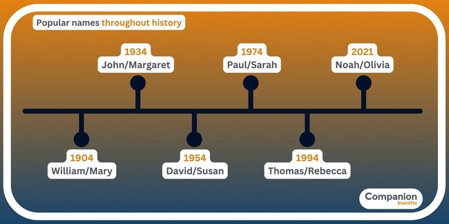 Companion Stairlifts has recently released a study, employing official government statistics, to produce a unique historical ranking of the most popular names for males and females since 1904. This study has led to the creation of searchable databases, allowing individuals to discover the popularity of their names over the years. The findings provide an intriguing and enjoyable way to compare name trends across various generations.