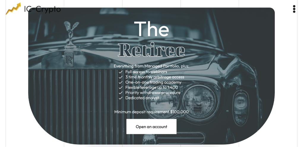 The Retiree account, requiring a minimum deposit of $100,000, is designed for high-net-worth individuals who treat trading as a significant part of their financial strategy. It offers full access to webinars and three-time monthly arbitrage access. Unique features include one-on-one trading academy sessions, flexible leverage up to 1:400, a priority withdrawal procedure, and a dedicated analyst. This account is suitable for serious traders seeking comprehensive educational resources and customized support.